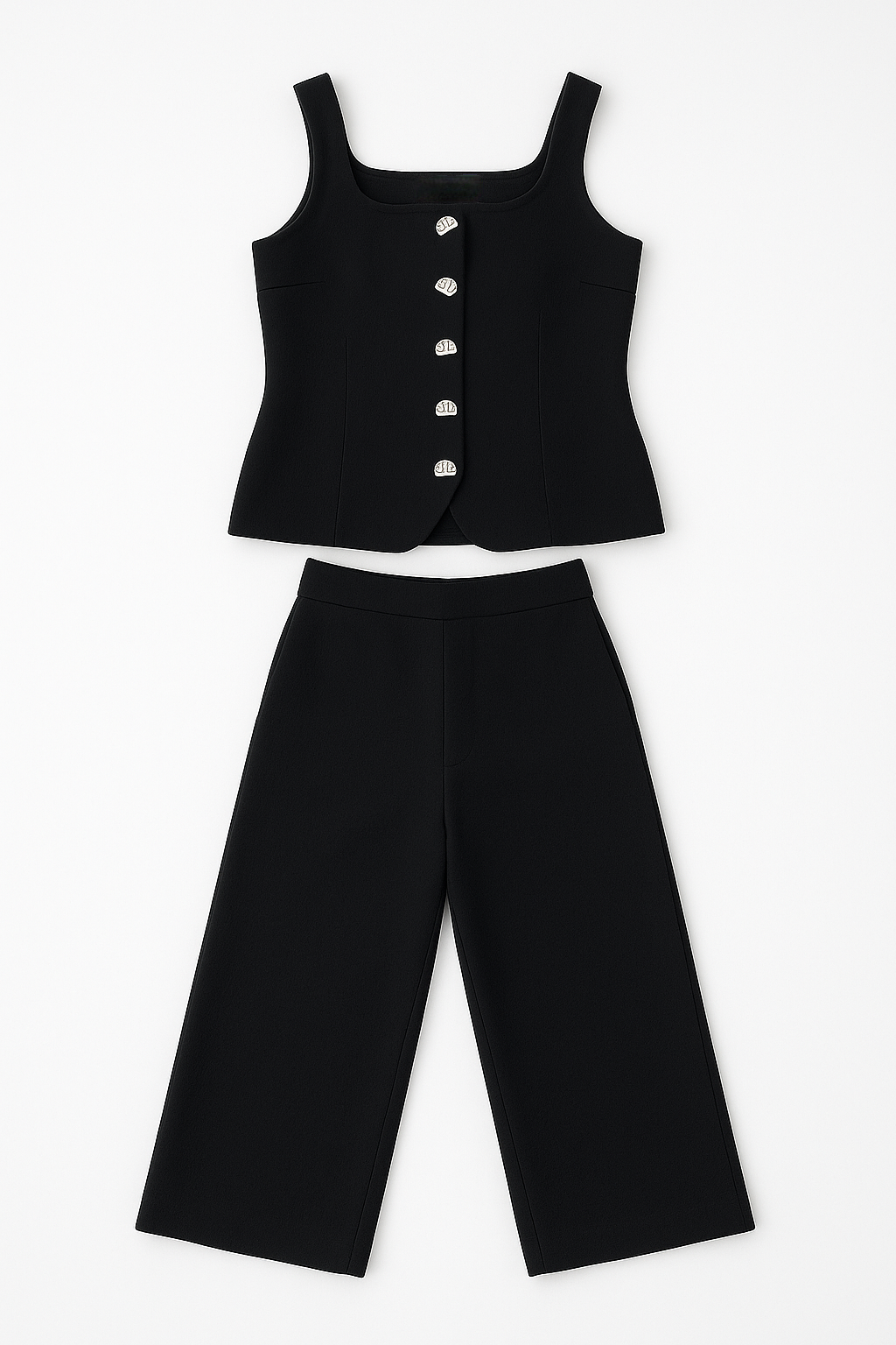 Confectionné dans une viscose épaisse et de qualité, cet ensemble allie confort et élégance. Il se compose d’un pantalon ample, resserré à la taille par un élastique discret, et d’un top sans manches à la coupe bien structuré vêtue de cinq petits boutons doré.