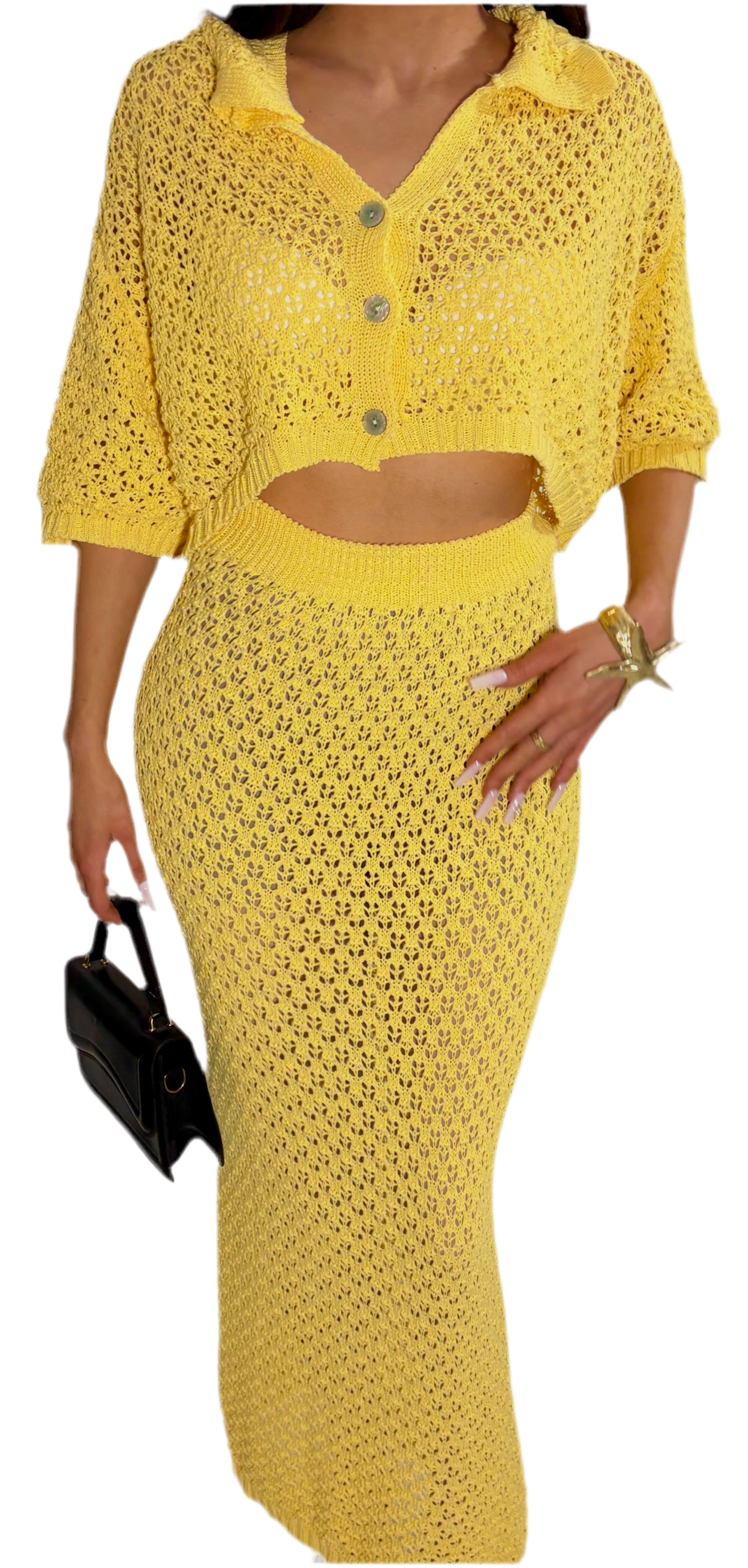 Confectionné dans une maille ajourée douce et texturée, il se compose d'un top boutonné et d'une jupe longue assortie. Parfait pour vos looks de jour comme de nuit, à porter sur un maillot ou en tenue chic et décontractée.